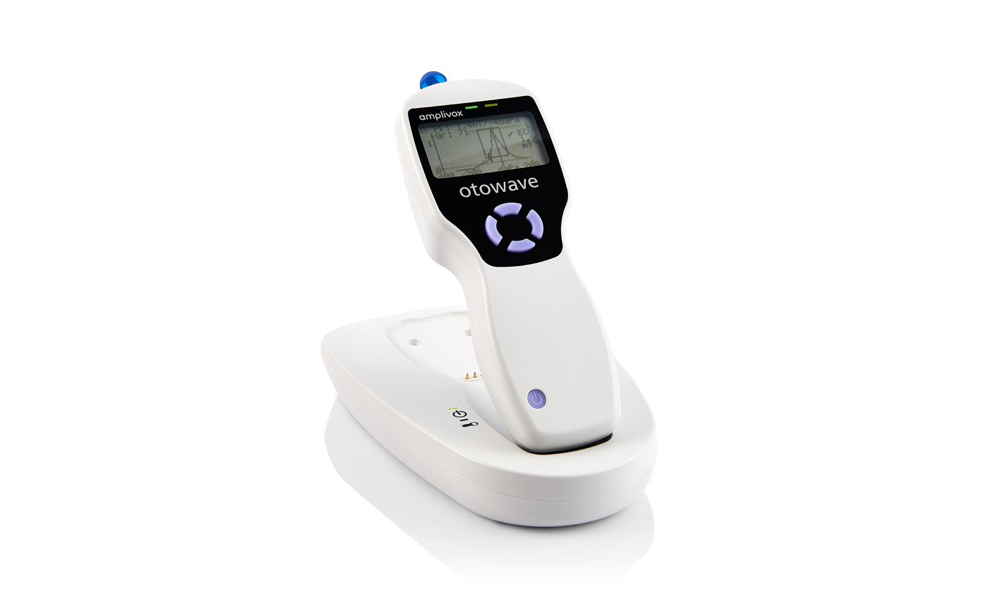 A compact, handheld screening tympanometer featuring a custom-designed docking station for seamless instrument charging and efficient test data transfer, perfectly suited for busy clinical environments.