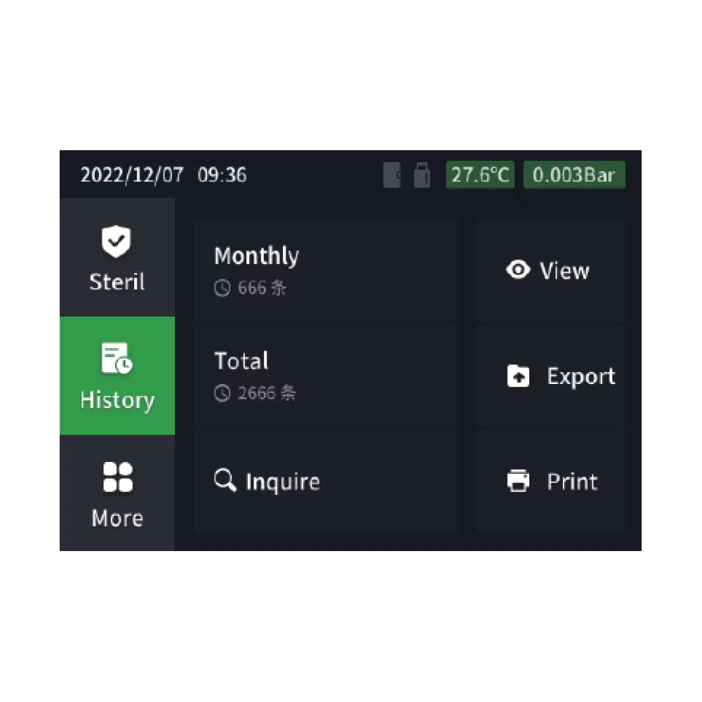 The system can store 30,000 sterilisation records which can be exported through a USB. These records can be referred by date. Each sterilisation record can be directly browsed on the screen, and a single record can also be reprinted.