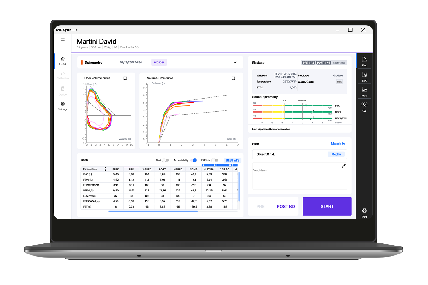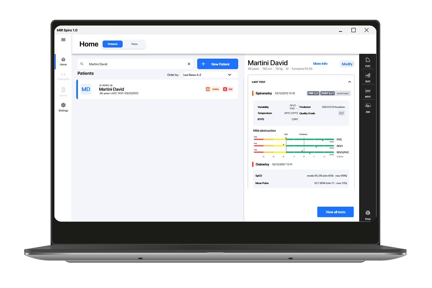 The MIR Spiro Software is a cutting-edge solution designed to enhance spirometry and oximetry assessments. Seamlessly integrating with EMR/EHR systems, it is compliant with the latest ATS/ERS guidelines and is available for both MacOS and Windows, making it accessible on desktop and laptop platforms.